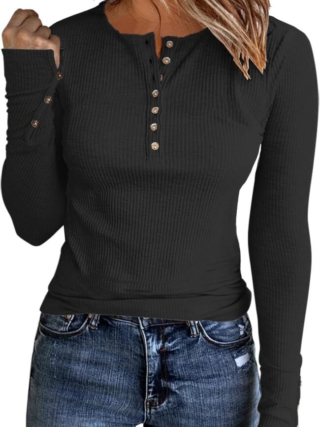 Features:Fashion Exposed Seam Detailing On Collar With Delicate Lathe Routing, Exquisite And Practical Button Decoration, And The Buttons On The Chest Can Be Untied As Needed, Ribbed Knit t Shirts With a Slim Fit Highlight Women's Perfect Figure
