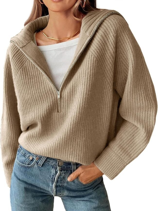 FEATURES - Sweater For Women / Fashion Sweaters With Zipper / Collared V Neckline With Zip / Long Sleeves With Knitted Cuffs / Smooth Practical Plain Color Zipper / Dropped Shoulders Design / Comfy Stretchy Knit Fabric / Ultra Soft Feeling / Ribbed Neckline And Hem Detail / Relaxed Loose Fit / Casual, Vintage And Cute Style