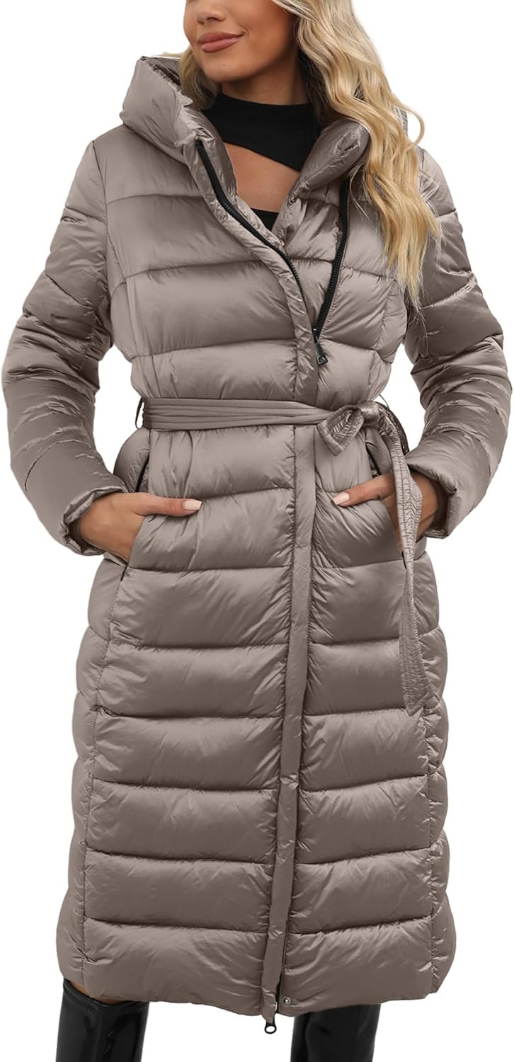 Women Jacket Lightweight Quilted Hooded Long Down Alternative Coat with Belt