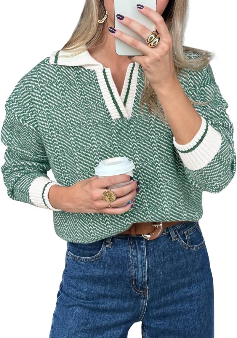 Women’s Fall Sweaters Tops Lapel V Neck Knit Sweater Color Block Long Sleeve Casual Soft Pullover Shirt