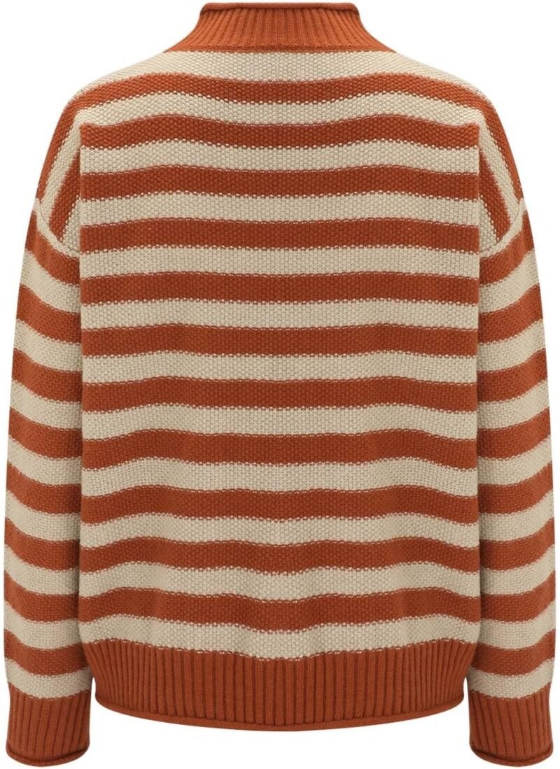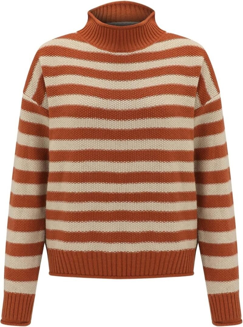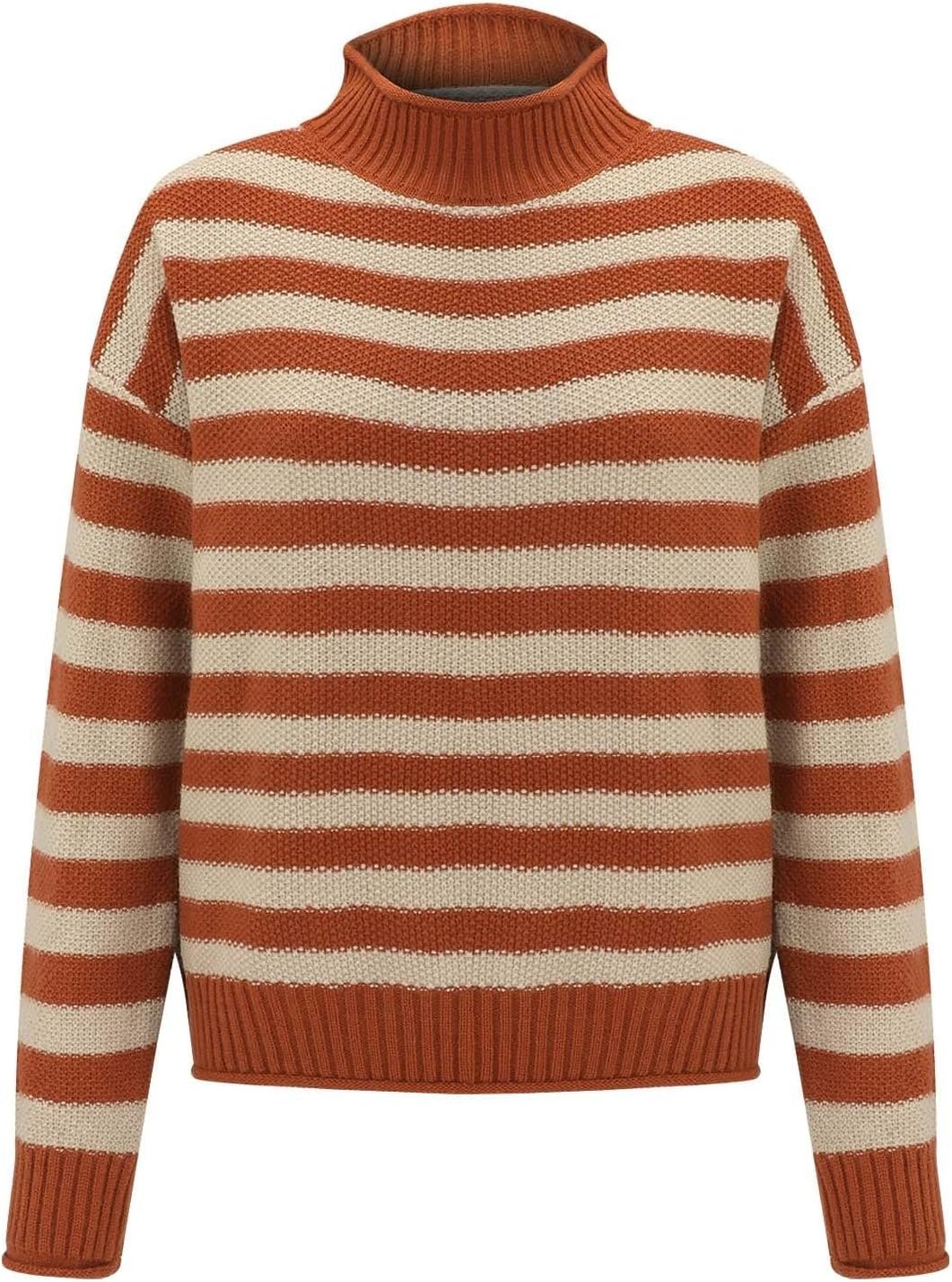 Women’s Retro Striped Contrast Half Turtleneck Sweater Orange and White Knitted Loose Causal Bottoming Sweaters